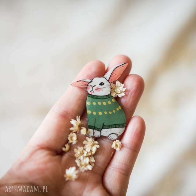 Broszka z zającem w swetrze może być noszona przez wszystkich: zarówno przez kobiety i mężczyzn.