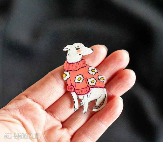 handmade broszka biały pies w różowym swetrze w kwiaty
