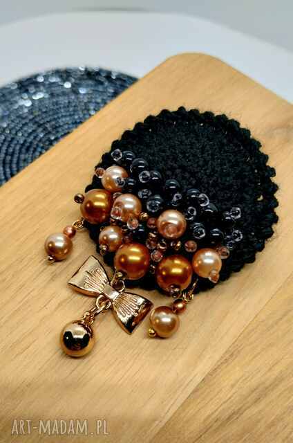 Broszka okrągła szydełkowa czarna - złote paski, szklane koraliki. Broszki handmade Szlachetnymi akcentami, Na miękkiej, delikatnie połyskujące, swetrem czy płaszczem48,00 zł
