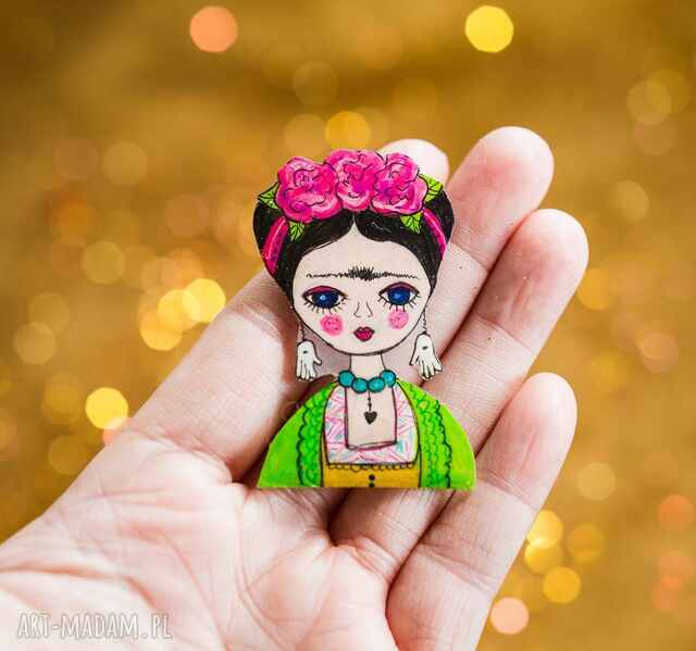 Broszka Frida różana została namalowana na folii termokurczliwej.