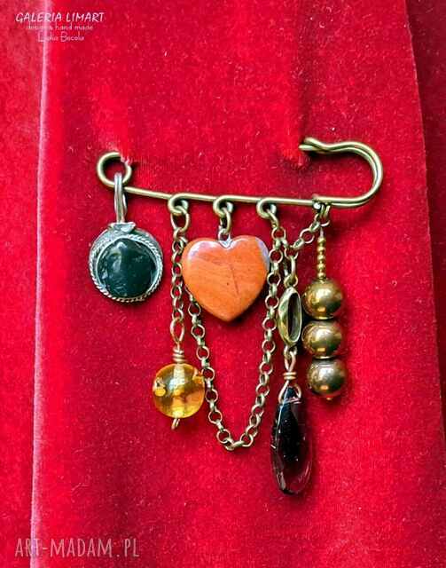 broszka niezwykła na agrafce w stylu boho handmade z sercem z jaspisu unikat