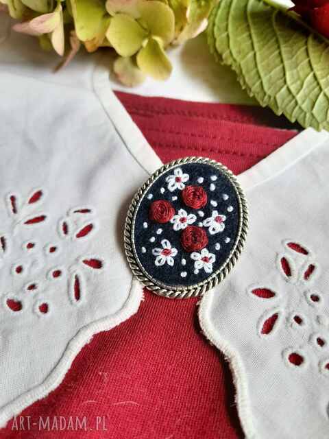 Broszka haftowana bordowe róże ogrodowe. Delikatna, haftowana ręcznie broszka dla wielbicielek romantycznego stylu z nutką retro100,00 zł