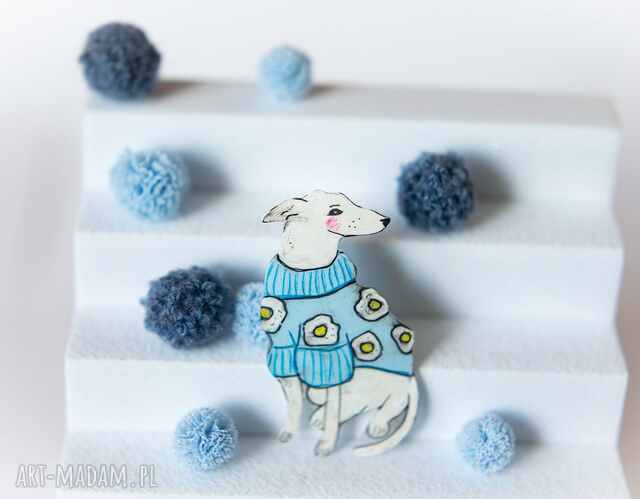 ręcznie wykonane broszka z psem w niebieskim swetrze w duże stokrotki