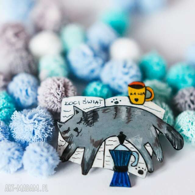 ręczne wykonanie broszka z szarym kotem romanem