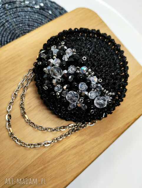 Broszka czarna szydełkowa ze szklanymi perełkami i kokardą. Broszki handmade Wśród nich znajdują się gładkie, eleganckim połysku, Ten drobny, 4,5 cm,40,00 zł