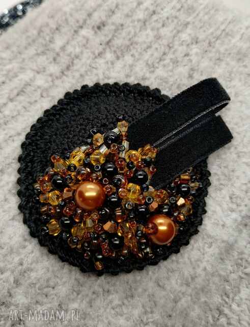 Broszka okrągła szydełkowa czarna - złote paski, szklane koraliki. Broszki handmade Szlachetnymi akcentami, Na miękkiej, delikatnie połyskujące, swetrem czy płaszczem48,00 zł