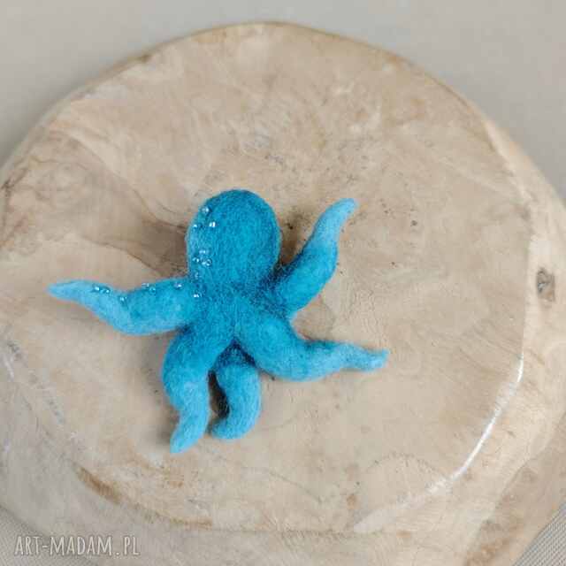 Broszka w formie ośmiornicy, w turkusowych kolorach. Filcowana ręcznie w technice igiełkowej z owczej wełn, ozdobiona koralikami.